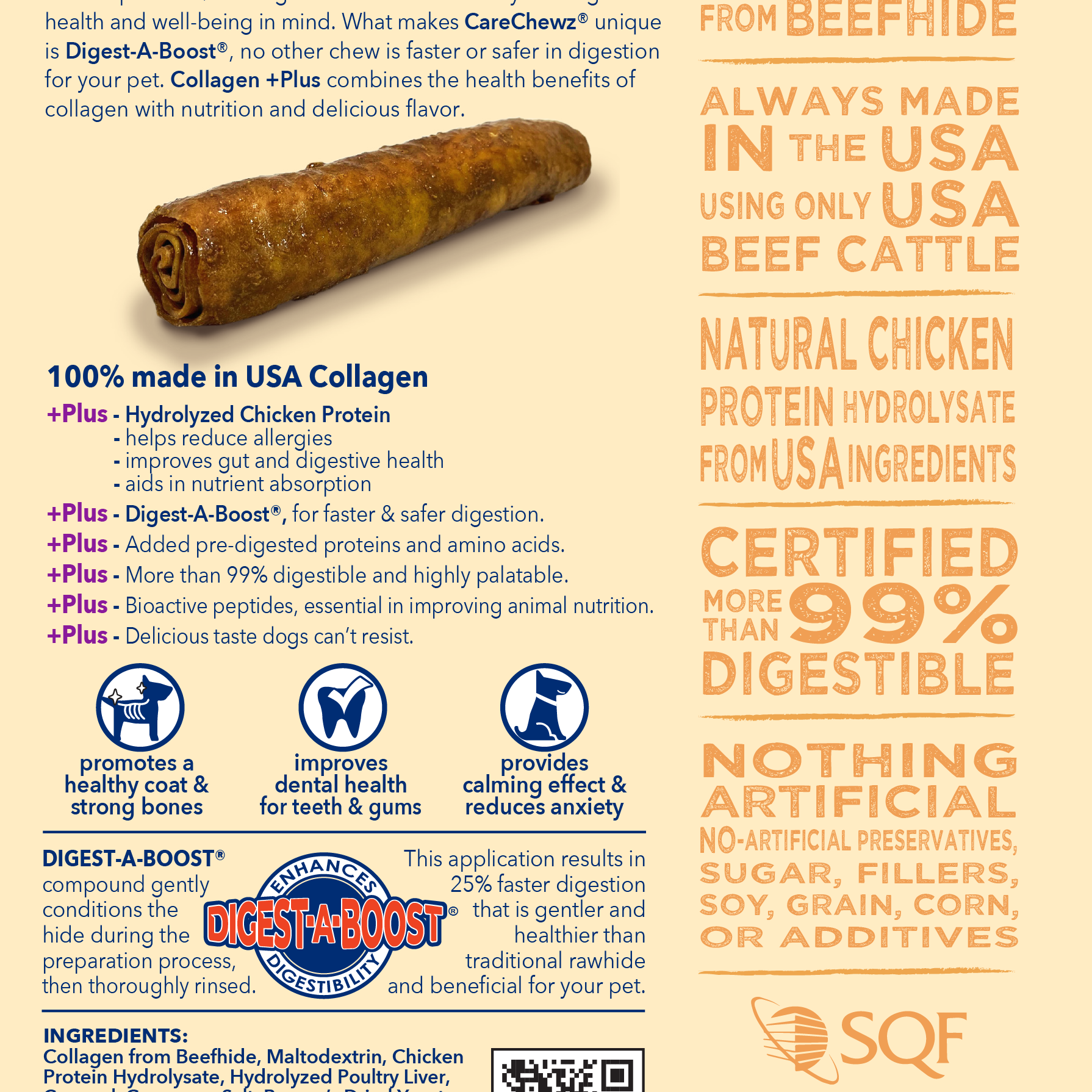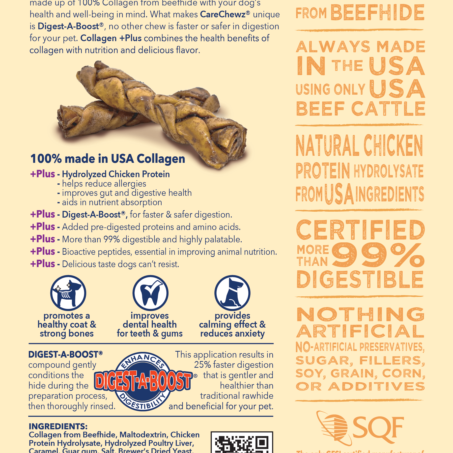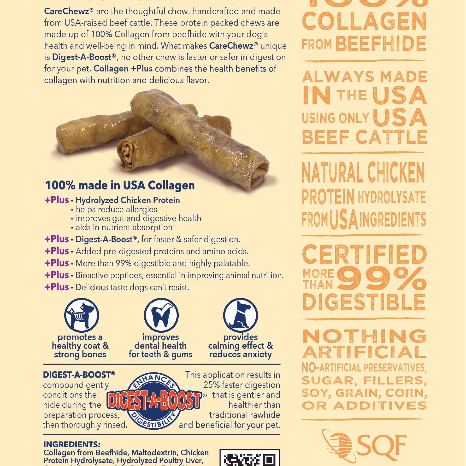 CareChewz® are made with care and safety in mind, our chews are handcrafted from a single ingredient, all natural 100% COLLAGEN from USA Beefhide, locally sourced, locally made with care. CareChewz® chicken marinade are made from limited ingredients with no preservatives or additives. The marinade permeates deep into the natural hide providing a long lasting flavor that dogs love.